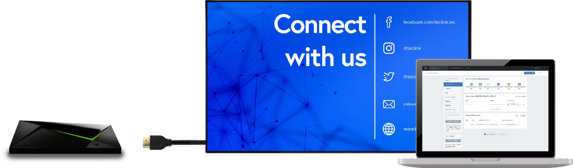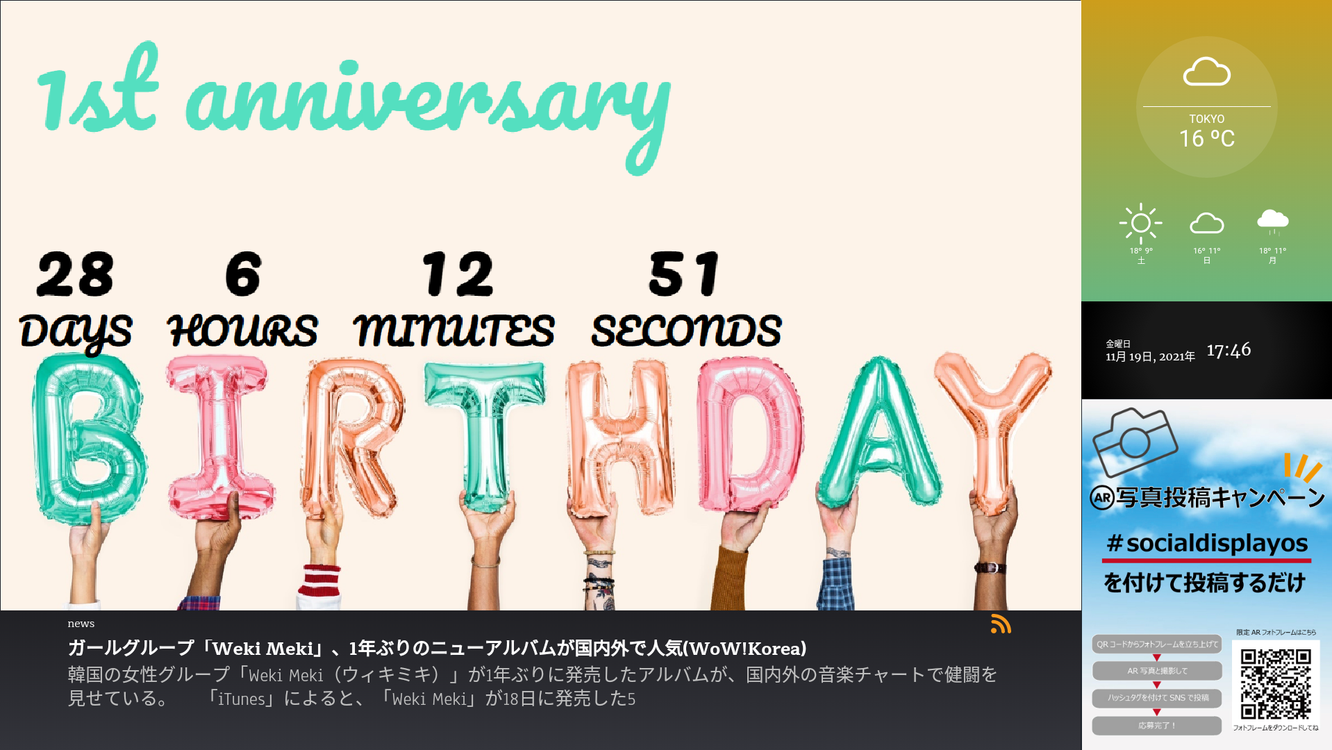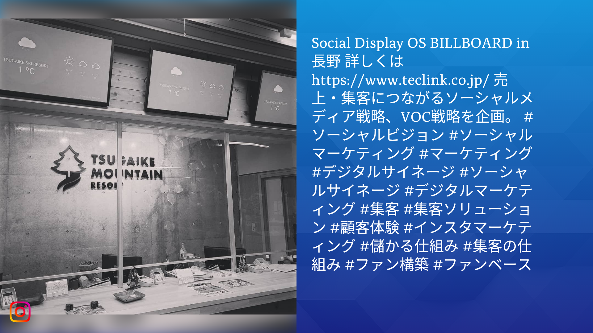 画像や動画、天気情報やニュースなど一般的なデジタルサイネージ要素に、口コミ(SNSの投稿)を連動させ