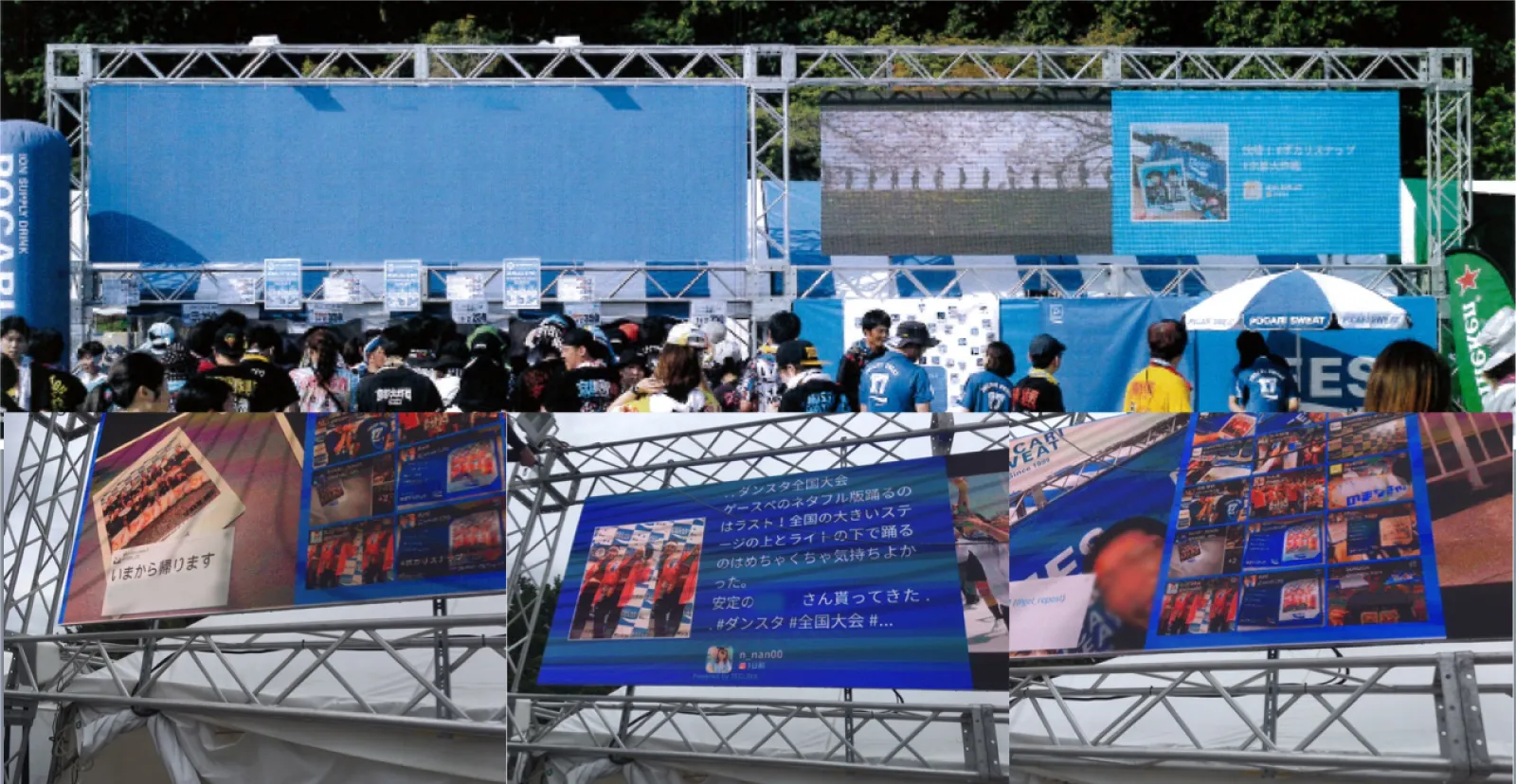 企業CM、イベントロゴに合わせ、ブース来場者(商品購入者)の投稿を特設ビジョンに放映。若い世代へのSNSを通じたマーケティングに活用。メーカー、商品名記載のハッシュタグでの拡散が実現。
